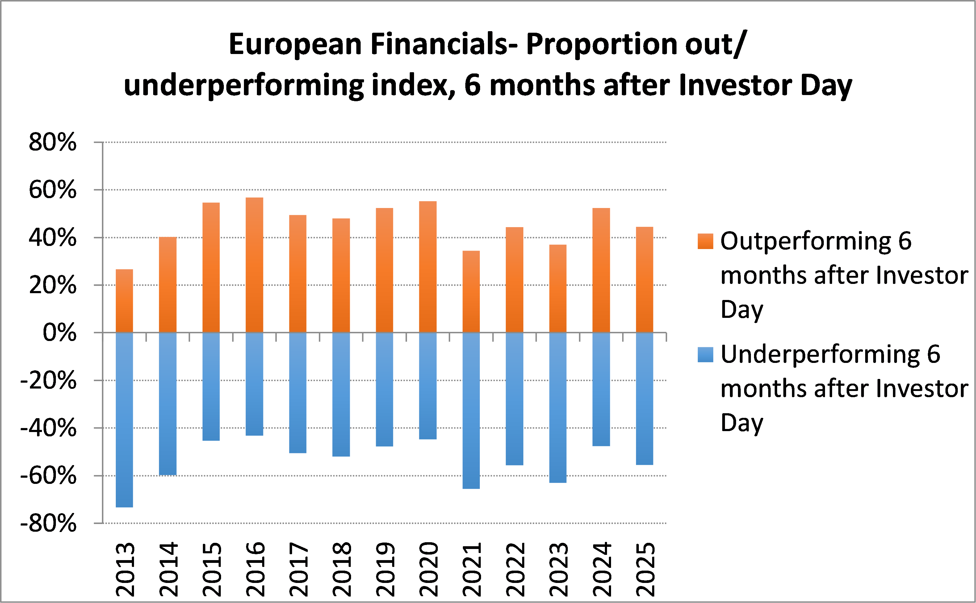 In a typical year in the mid to large cap European listed financials world around 20-30 such Investor Days take place. A typical share price pattern has emerged; in the month before the event, the share prices enjoy a ramp up, raising the bar of expectations. After all why would a management team host an Investor Day if they didn’t have something positive to announce? However, judged on the basis of share price performance in the 6 months thereafter, a majority lose that outperformance. And here, don’t get fooled between absolute over relative performance. It’s the latter which really counts.