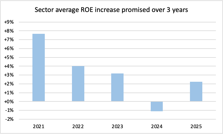Over the past 6 years, the promised ROE improvements at Investor Days has generally become less ambitious, in turn reflecting the higher starting levels of profitability as well as changes in future interest rate expectations. Whereas in 2021 across the sector banks were promising an ROE improvement of almost +8% on average over a 3-year period, by 2025 that had fallen to +2%.