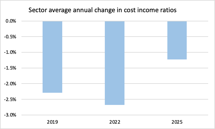 In part reflecting these same trends, the sector’s commitment for cost income ratio improvements has similarly become less ambitious. Back in 2019, banks holding Investor Days on average were promising over 2% per annum improvement in their cost income ratio; for banks holding Investor Days in 2025, that pace of improvement had fallen to just over 1%.