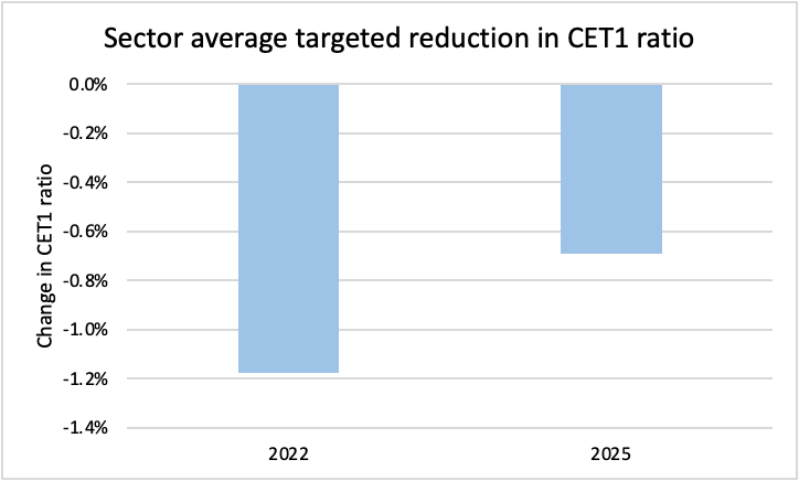 As noted, the post financial crisis re-regulation meant that it was clear that banks entered the early 2020s with surplus capital. As a result, an important feature of those early 2020s Investor Days was the commitment to reduce capital ratios. As shown below, in 2022 on average banks holding Investor Days committed to more than a 1% reduction in their CET1 ratios. As those capital ratios have started to come down, and as other uses of capital have become more important (e.g. faster RWA formation, M&A) so the commitment to reduce capital ratios from current levels has nearly halved.